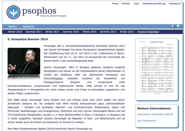 Prvu nagradu pri organizaciji „psophos“ i Lietzeorchestera e.V. na petom konkursu Kompolize ljeta 2014 god., osvoio je Jasmin Osmanagić sa svojom kompozicijom „Simfonijski agitato“. Premijera je izvedena 08.07.2014 god. u crkvi Linde u Berlin-Wilmersdorfu i 11.07.2014 god. u koncertnoj dvorani Berlinskog Univerziteta umjetnosti u Hardenbergstraße.
